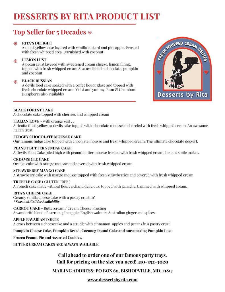 At Desserts by Rita, you will discover that each signature Rita’s Desserts is handcrafted with only the best ingredients available. For years, Rita’s Desserts have been enjoyed in local restaurants and right at home thanks to convenient pick up locations in Worcester County. Rita’s Desserts are made daily and may also be ordered in advance for a special occasion. We recommend that your order for a Rita’s Dessert is placed 30-48 days prior to your event to ensure that your request is fulfilled or you may call the shop for daily availability. Thank you! Black Russian Lemon Lust Rita’s Delight